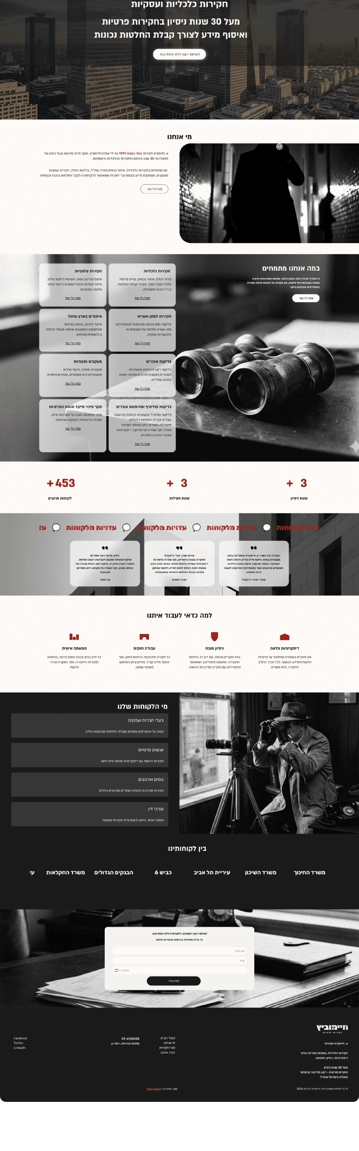 אפיון ועיצוב אתר תדמית למשרד חקירות פרטיות המתמחה בחקירות כלכליות ועסקיות. הפרויקט כלל בניית שפה ויזואלית יוקרתית ואמינה, חידוד מסרים מקצועיים והובלת המשתמש לפנייה ברורה ומיידית.